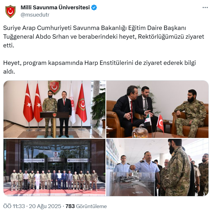 Milli Savunma Üniversitesi’nin resmi sosyal medya hesabından yapılan paylaşımda, “Suriye Arap Cumhuriyeti Savunma Bakanlığı Eğitim Daire Başkanı Tuğgeneral Abdo Srhan ve beraberindeki heyet, Rektörlüğümüzü ziyaret etti. Heyet, program kapsamında Harp Enstitülerini de ziyaret ederek bilgi aldı” denildi.